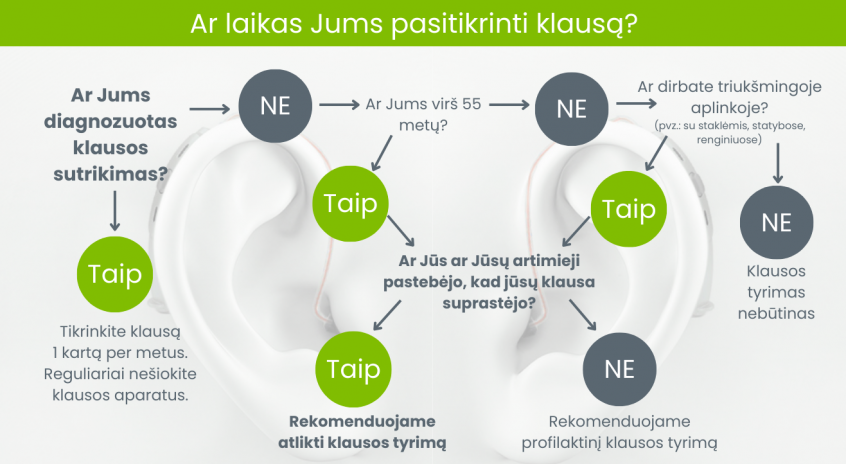 Jei Jums yra 55 + metų, jau reiktų pradėti tikrinti klausą bent kartą per metus, ypač jei dirbate triukšmingoje aplinkoje,